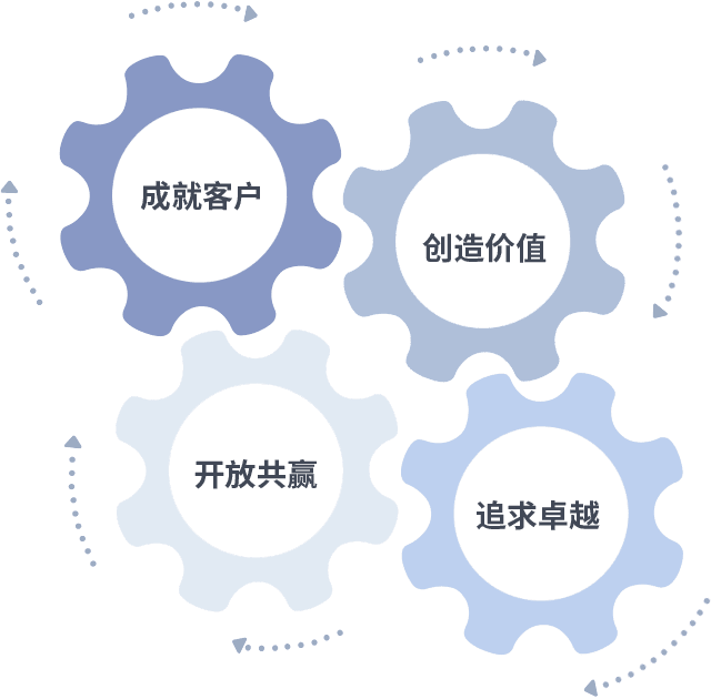 成就客户是一切决策的出发点,,创造价值是衡量所有工作的标准,,,,追求卓越是我们做事做人的态度,,,,开放共赢是我们的格局也是最终的结果。。。价值观的齿轮环环相扣,,推动着组织里的每个人不断向前。。。。